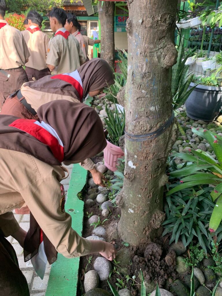 Bapak/Ibu Wali Kelas juga terlihat mendampingi siswa dalam membersihkan kelas dan menata tanaman di sekitarnya.